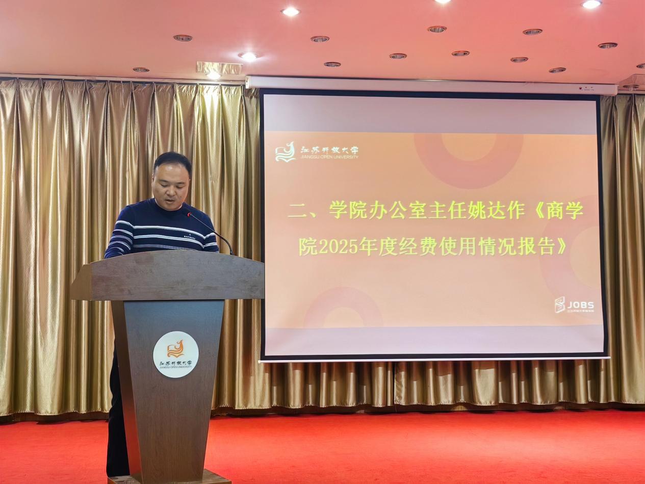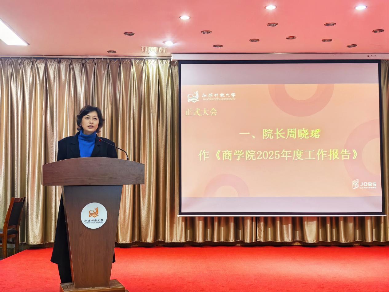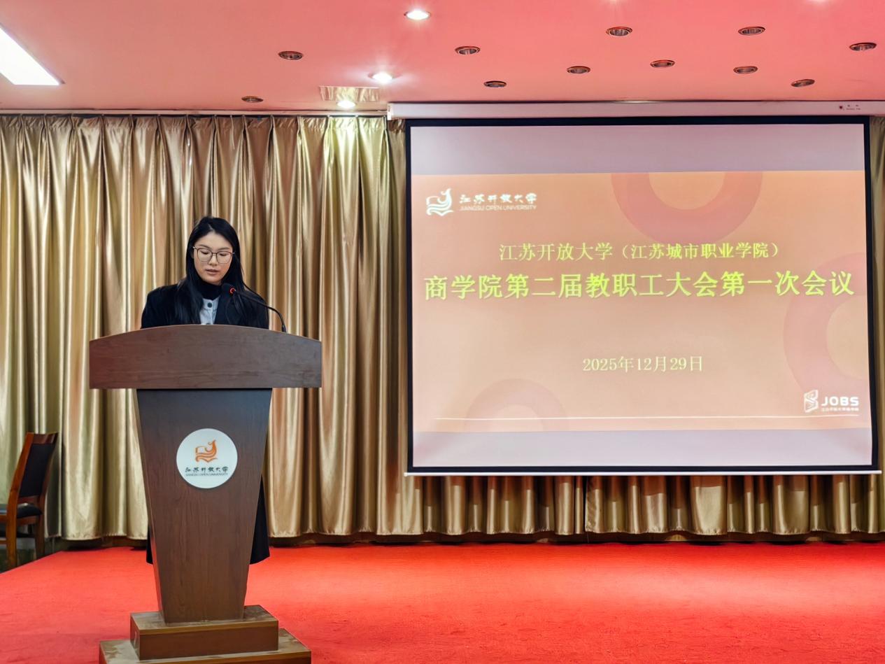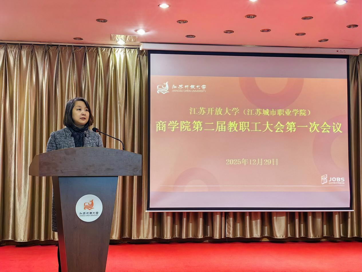 2025年12月29日,江苏开放大学(江苏城市职业学院)商学院在东校区图书馆5楼报告厅召开第二届教职工大会第一次会议。大会以“立足新阶段 谋划新蓝图 以实干实绩书写商学院高质量发展新篇章”为主题,凝聚全院共识,共商发展大计。学院全体教职工参加会议,大会由学院党总支副书记、副院长丁晓华主持。